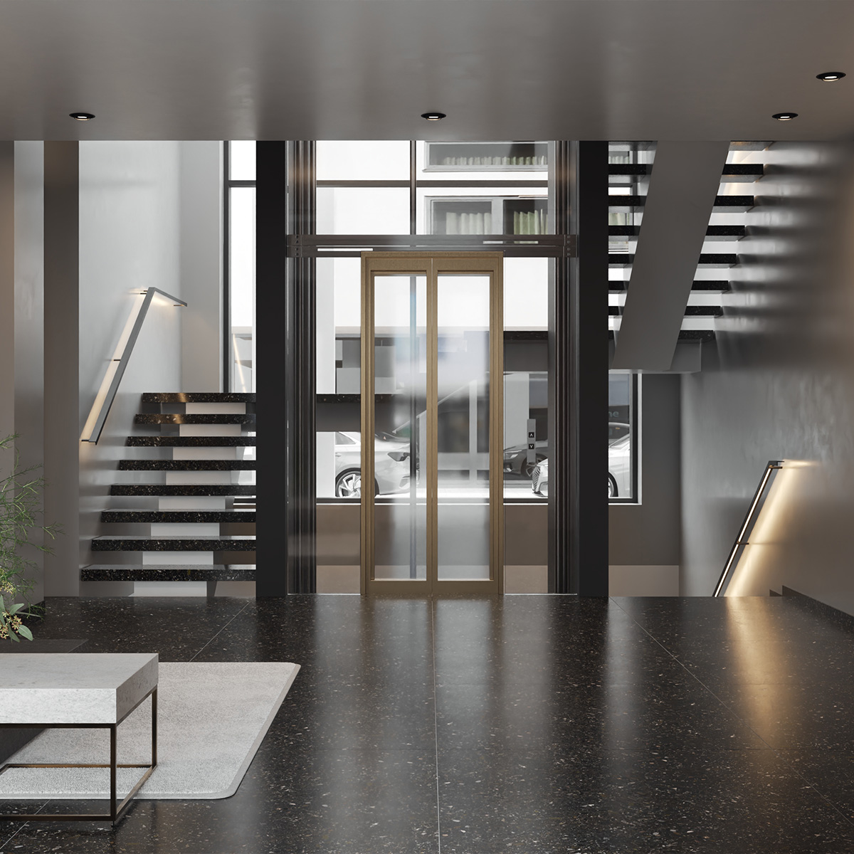 Avar, stiilselt sisustatud, elamusliku valgustusega fuajee; tumedad terrazzo põrandad ja trepid; grandioosne karastatud klaasist liftišaht; pähklipuu viimistlusega ustenišid; meeldiv akustika mürasummutavate lagede abil.